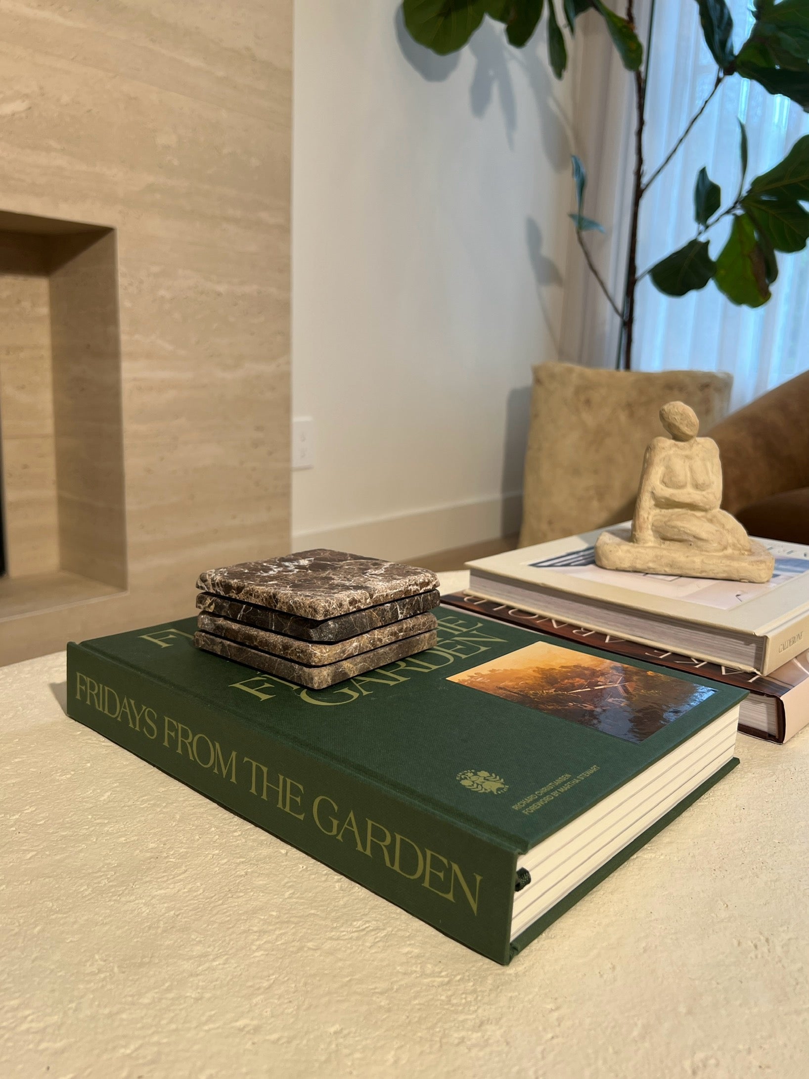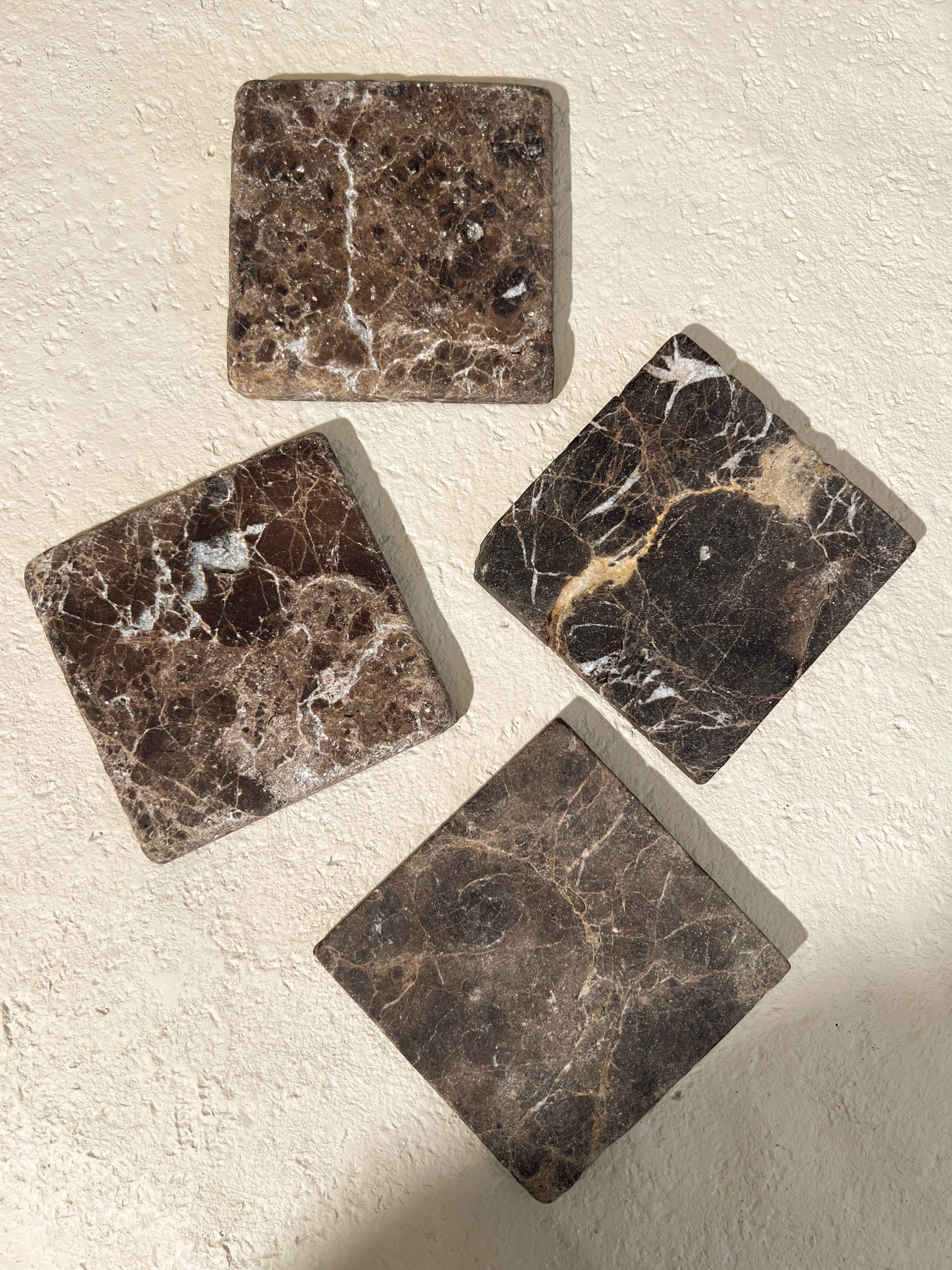 ABOUT | Four-piece natural leathered Spanish Emperador Marble Coaster set with cork bottoms. The coaster set displayed in the images is the exact set you will receive.