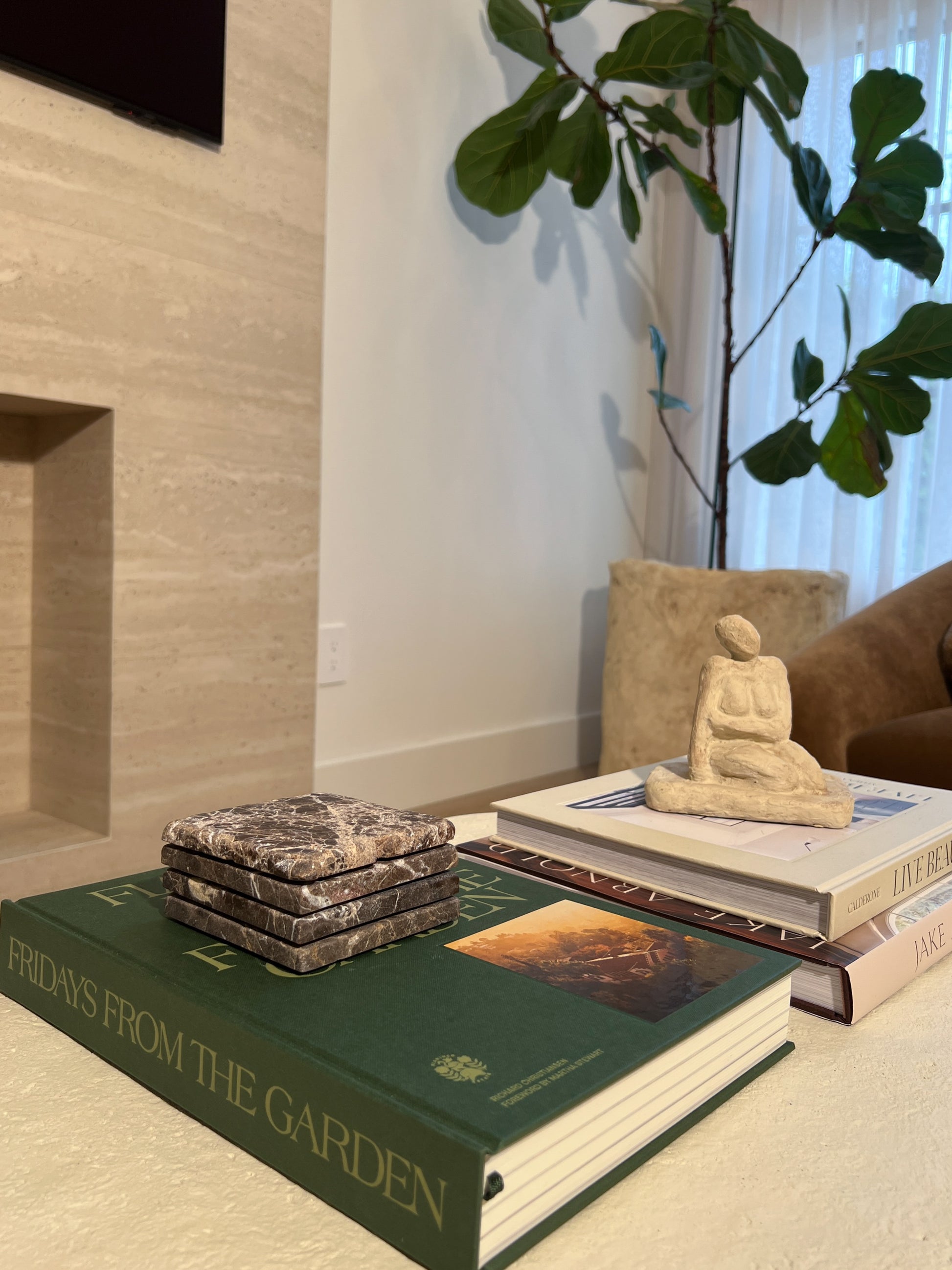 ABOUT | Four-piece natural leathered Spanish Emperador Marble Coaster set with cork bottoms. The coaster set displayed in the images is the exact set you will receive.